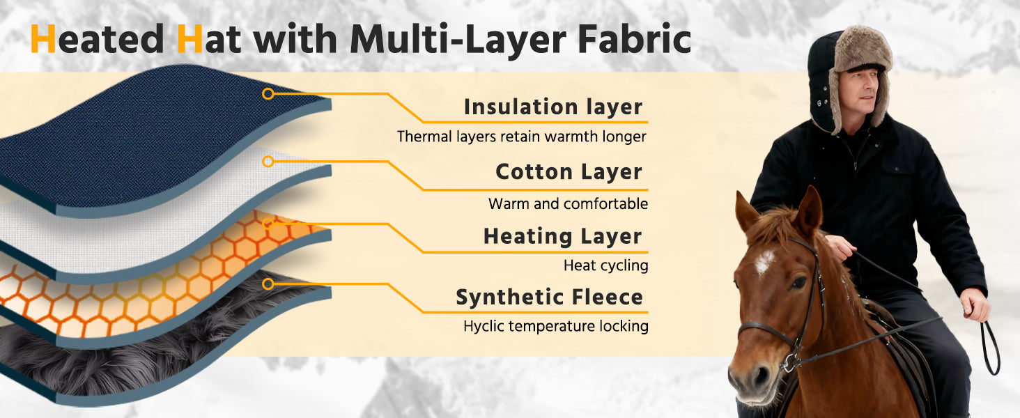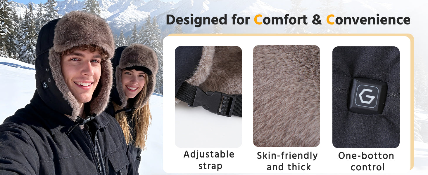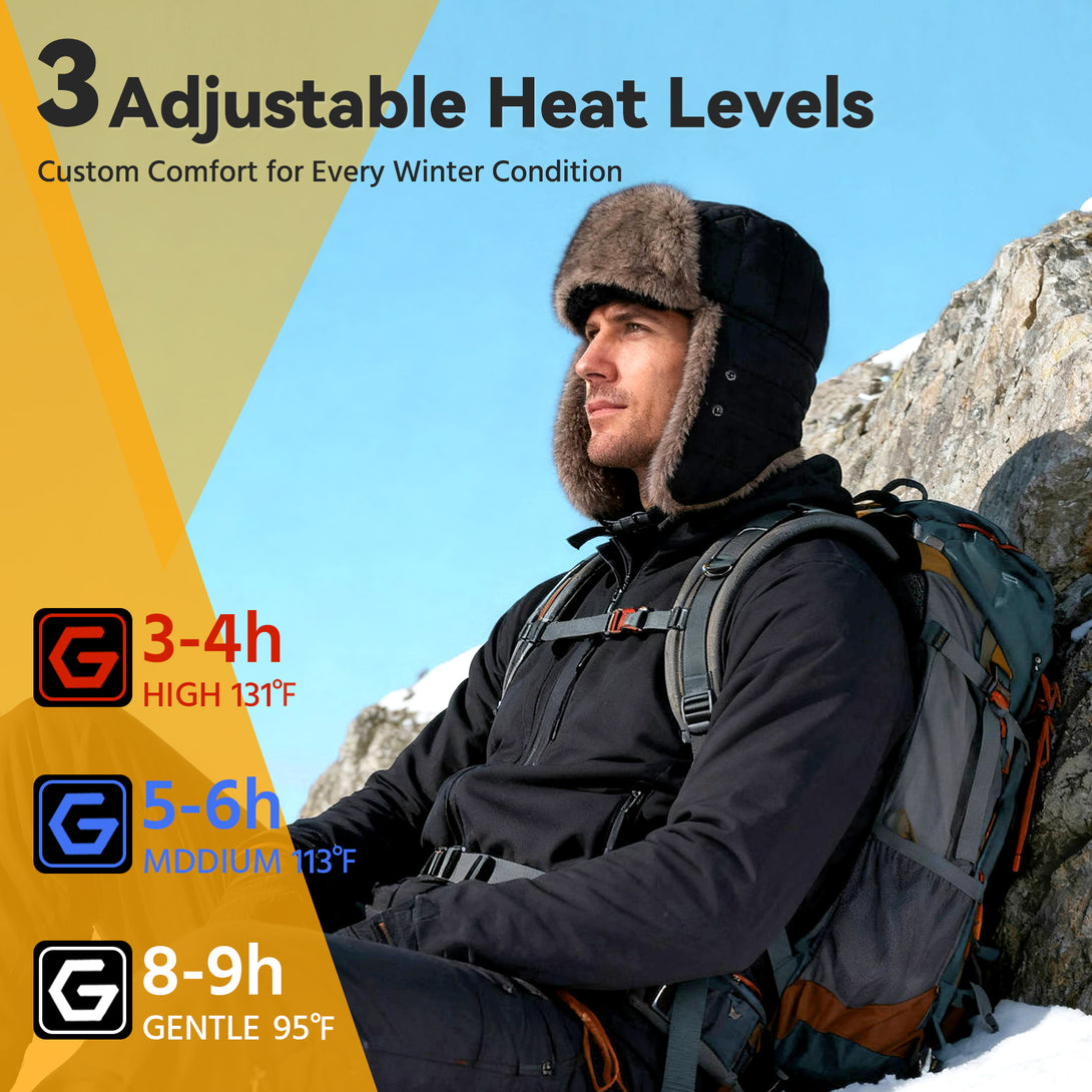 • GRAPHENE WARMTH: Utilizing graphene heating technology, just a touch of a button delivers instant warmth, enveloping your head in sustained comfort. Whether braving the morning commute. chill, working outdoors in snowy conditions, or enjoying weekend activities like skiing or ice fishing, it swiftly banishes the cold, keeping you warm and mobile.