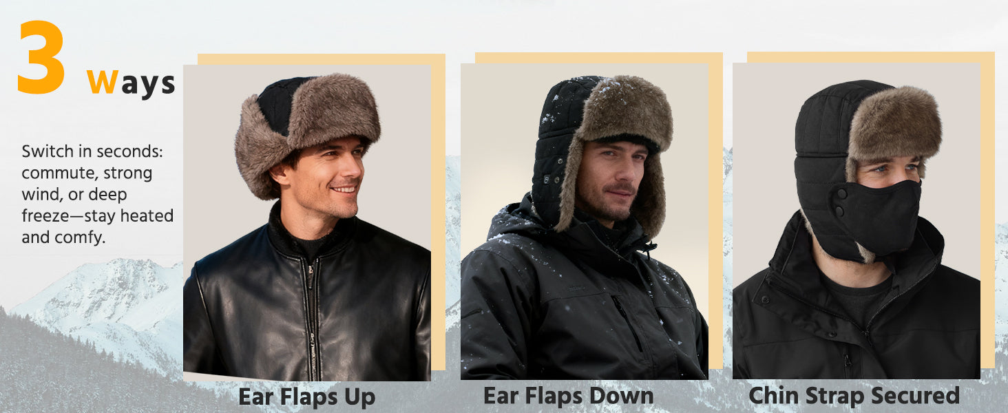 • MULTI-WEAR STYLE: Innovative design supports three wearing methods: ear flaps flipped up, ear flaps pressed down, and chin strap secured. Press down ear flaps for windproof warmth during. commutes; flip up ear flaps for breathable lightness during workouts; tighten chin strap for enhanced protection in extreme cold. One hat, multiple uses, adapting to diverse scenarios.